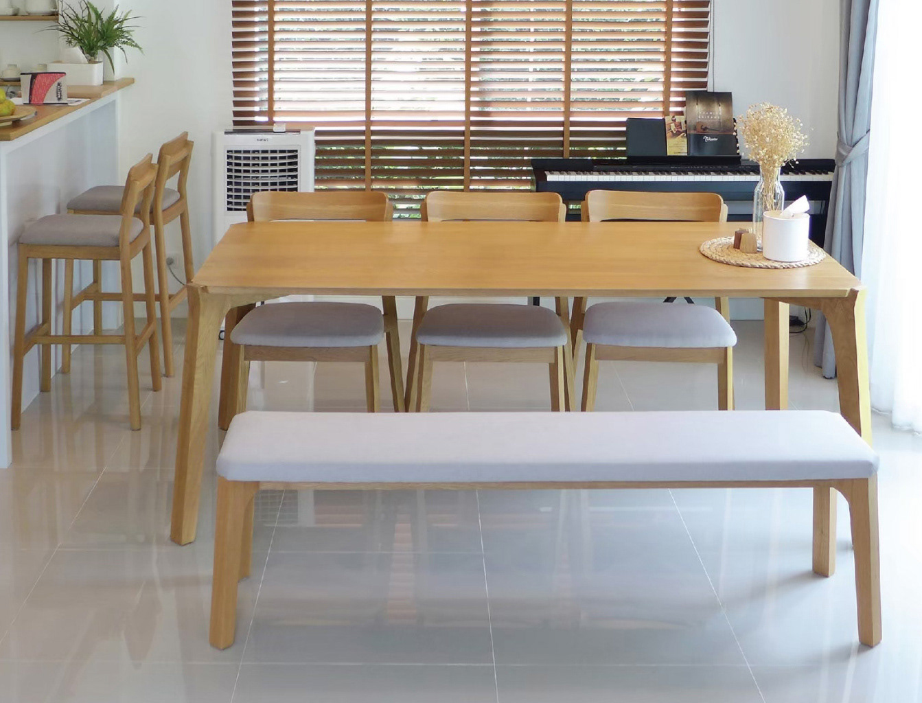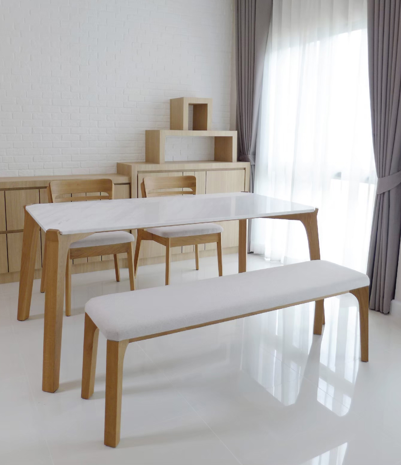 Clean shapes and variety of finishes make this table suitable to many settings. Legs are positioned at an angle similar to Porro Table. The top can be made from solid oak wood or upholstery seat. Porro Bench can be paired with regular chairs and armchairs.