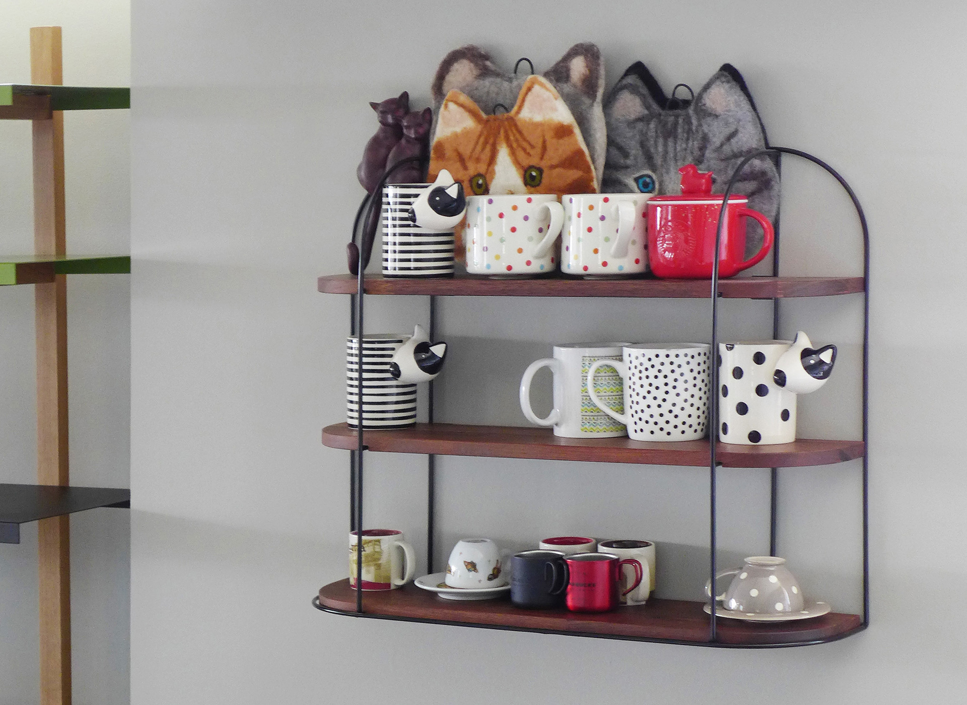 Frame made from steel wire with powder-coated and shelf made from oak or walnut finger jointed with a matte clear lacquer. Slight color variations can occur due to the inherent characteristics of the material.